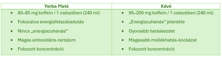 A Yerba Maté körülbelül 30–50 mg koffeint tartalmaz 100 ml italonként, ami kevesebb, mint a kávé, de több, mint a tea. Az összehasonlítás érdekében: