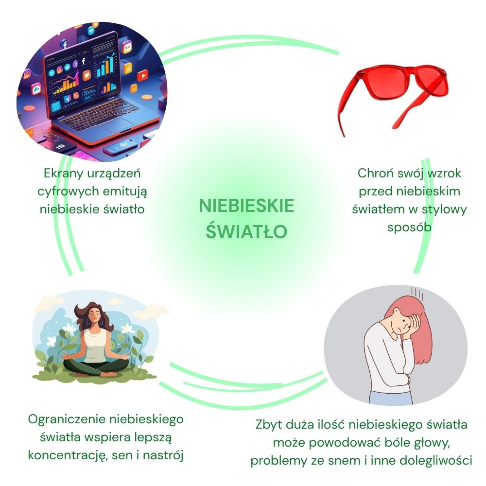 W dzisiejszych czasach, kiedy spędzamy godziny pod sztucznym oświetleniem i przed ekranami, nasze oczy codziennie są mocno obciążone. Niewidzialny wróg? Tak, poznaj niebieskie światło. Niebieskie światło bowiem zakłóca produkcję melatoniny, pogarsza jakość snu i obciąża narząd wzroku. Rozwiązanie jest przy tym bardzo proste. Wystarczy zaopatrzyć się w specjalne okulary z pełną blokadą niebieskiego spektrum.